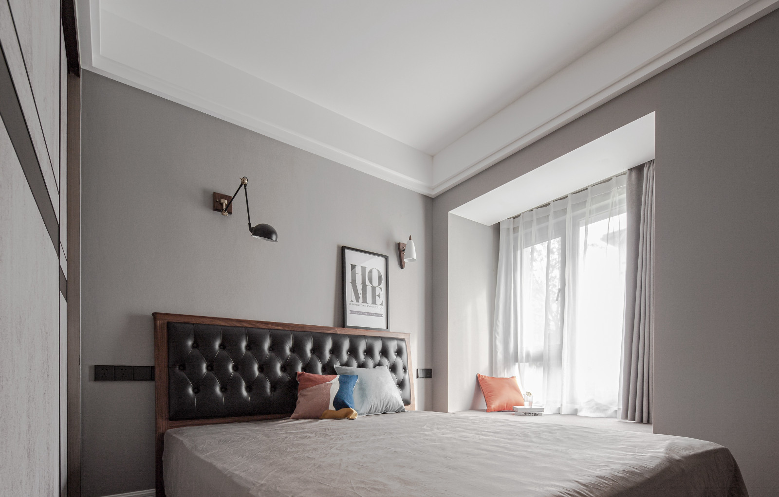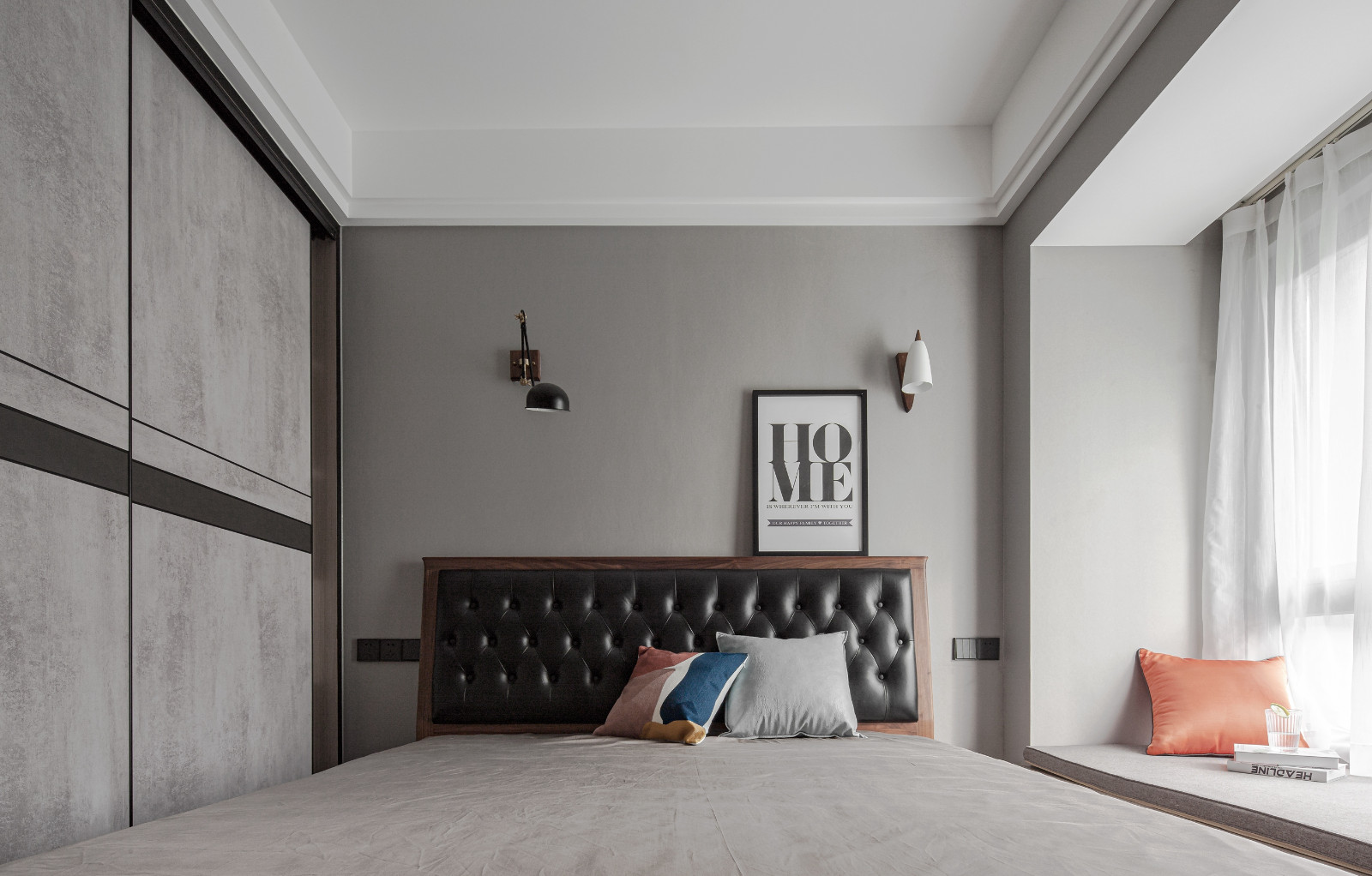 主臥整體灰調,淺色灰背景墻,搭配深灰色皮質床靠背,棕色木紋家具經典。